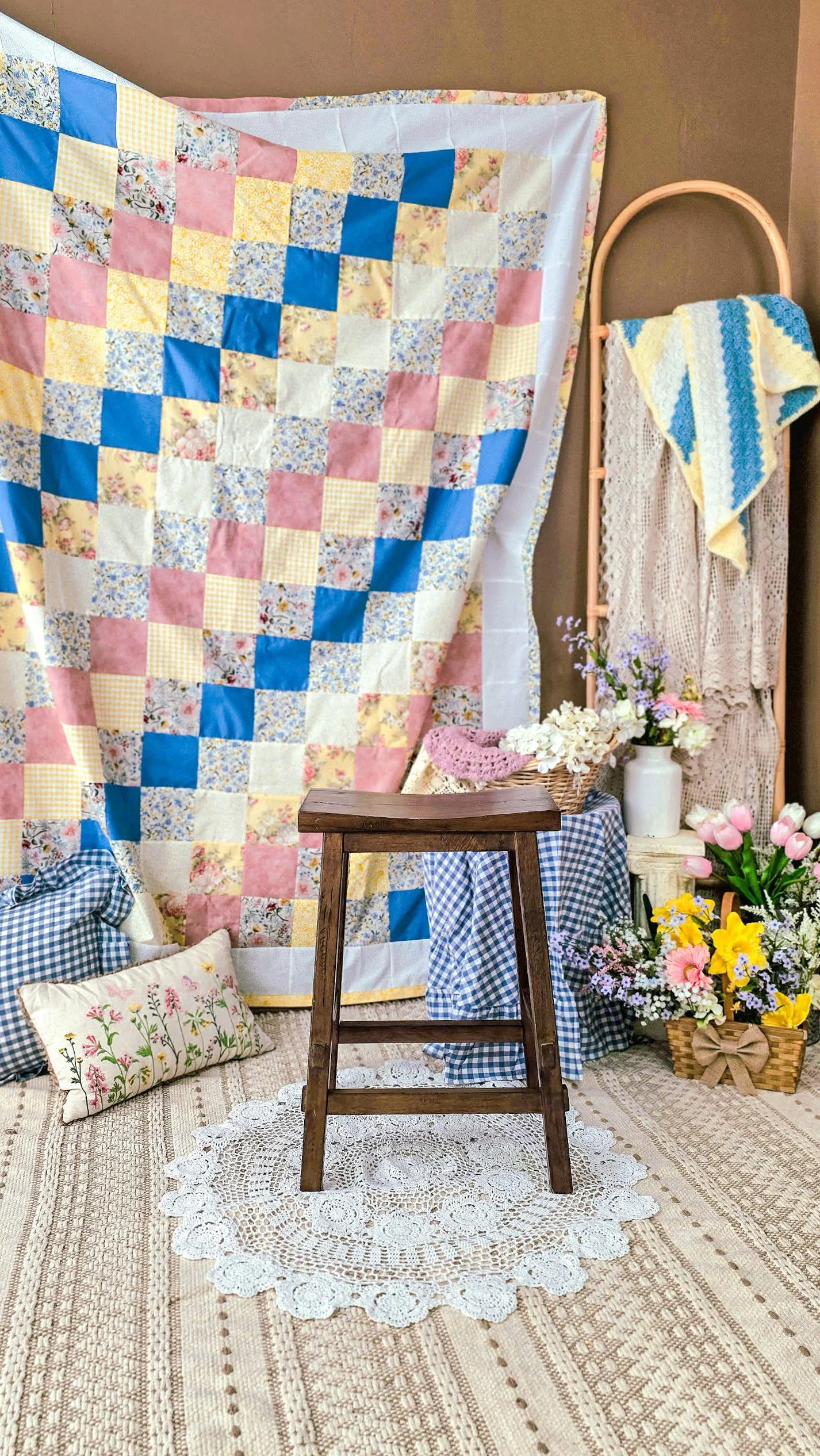 • Outfits from our professional studio wardrobe are not available for DIY sessions, so you’ll need to bring your own clothing. We do, however, provide a variety of props that are included with each set. These range from items that match the seasonal backdrops to everyday favorites like baby swaddles, letter boards, milestone blocks, stools, baby chairs, and boppy loungers. Everything is designed to help you style your photos easily while keeping the focus on your little ones.